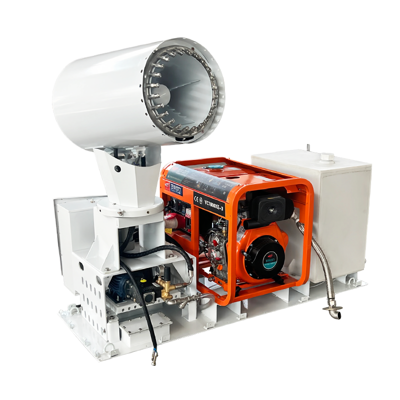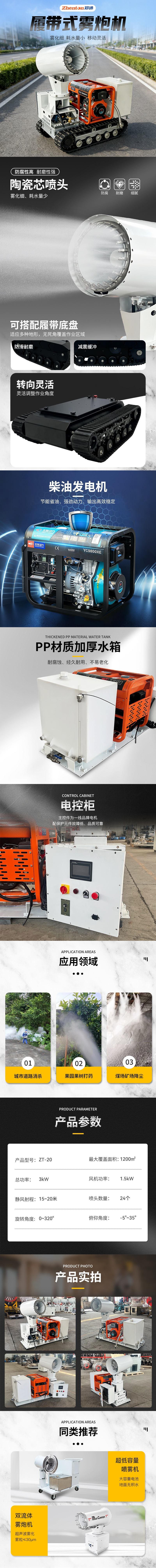 產品特點:ZT-20覆帶式霧炮機,整機僅3 kW總功率,風機1.5 kW,可打出15-20米靜風射程,輕松覆蓋1200 m2大面積,24個精密不銹鋼雙流噴頭,把水滴切割成30-150 μm微霧,抑塵效率提升60%,同時比傳統水槍節水70%,環保又省錢。整機采用覆帶式底盤,結構緊湊,旋轉0-320°、俯仰-5-35°全液壓遙控,隨機附帶防凍自動泄水閥,冬季無需排空,開機即用。3 kW功率可直接接220 V、380V或小型柴油機組。